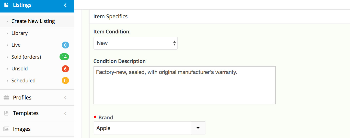 Note that you can return to existing live listings and edit them to add item specifics as well, using the same steps outlined above. Changes that you make will be automatically sent to eBay and reflected in your live listings.